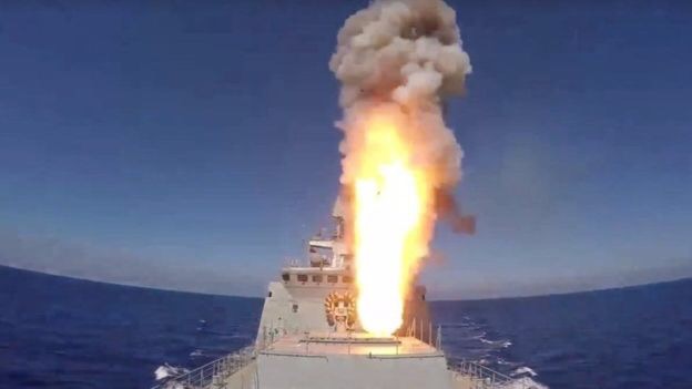 Ubushikiranganji bwo kwivuna abansi bw’Uburusiya bwavuze ko igisirikare cabwo co mu mazi cateye « missiles » zine zigurukira hafi mu bibanza vy’umugwi wa leta y’iki Islamu, « Islamic State » (IS) hafi y’igisagara ca Palmyra mu gihugu ca Syria.Mw’itangazo bwasohoye, ubwo bushikiranganji bwavuze ko bwateye ubunyegero buri mu buseruko bw’igisagara, hari ibigwanisho bikomakomeye n’abagwanyi bimuwe bakuwe Raqqa.