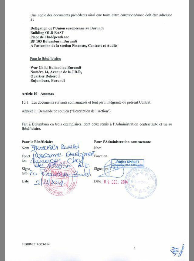 En réalité, ces mystérieux annexes ne sont que des ordres de missions à exécuter par les bénéficiaires finaux, War Child Holland Burundi n’étant qu’un bénéficiaire intermédiaire. Pour ces deux contrats, l’Union Européenne via l’ONG War Child Holland Burundi, signe ce contrat de financement de l’évacuation des ressortissants Burundais hors territoire burundais, pour « services rendus », plus précisément pour leur collaboration et participation active dans le ternissement de l’image du Burundi en matière des droits de l’homme.
