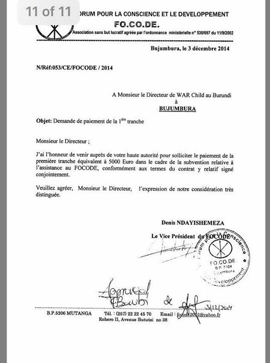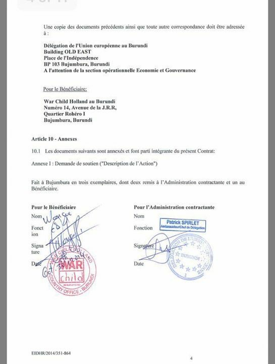 En réalité, ces mystérieux annexes ne sont que des ordres de missions à exécuter par les bénéficiaires finaux, War Child Holland Burundi n’étant qu’un bénéficiaire intermédiaire. Pour ces deux contrats, l’Union Européenne via l’ONG War Child Holland Burundi, signe ce contrat de financement de l’évacuation des ressortissants Burundais hors territoire burundais, pour « services rendus », plus précisément pour leur collaboration et participation active dans le ternissement de l’image du Burundi en matière des droits de l’homme.