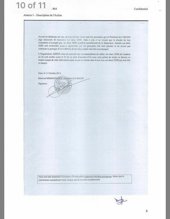 Le deuxième contrat a pour référence EIDHR 214/353-854. Le FOCODE demande le financement pour l’évacuation de Pacifique NININAHAZWE et sa famille du territoire national vers l’étranger, en Uganda plus précisément selon les termes de l’accord entre l’Union Européenne et l’ONG War Child Holland Burundi. Dans l’exposé des motifs Pacifique NININAHAZWE est décrit comme un militant des droits de l’homme, pacifiste dont la vie est menacée à cause de son opposition à la candidature de Pierre NKURUNZIZA.