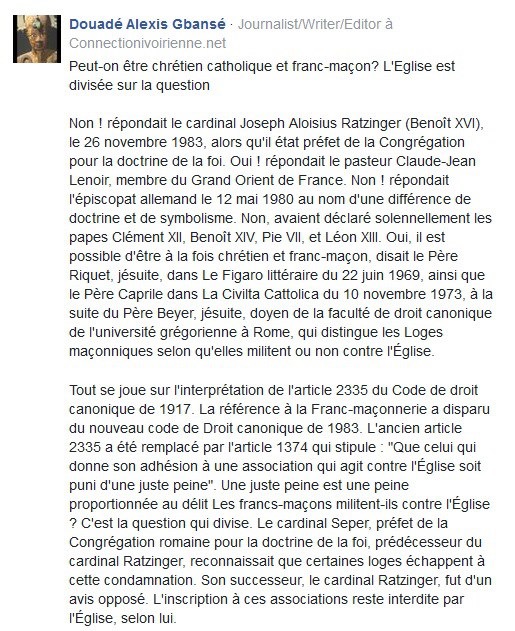 Un maitre Franc-Maçon attaque les évêques de Côte-d’Ivoire: Un prêtre contre-attaqueLa conférence épiscopale de Côte d’Ivoire lors de sa dernière rencontre dans le diocèse de Bassam, a publié une déclaration dans laquelle elle a porté ses réflexions sur la Franc-Maçonnerie en invitant ses pasteurs et tous les chrétiens à garder leur foi en la Sainte Trinité. Elle a affirmé sans ambigüité l’incompatibilité entre l’Eglise catholique dans ses doctrines et la Franc-Maçonnerie. Cette lettre des évêques suscite des réactions dans le monde des Maçons. Un des leurs de manière officielle a réagi pour contredire le message des évêques. Cette réaction de celui qui se fait appeler Maître Maçon, je pense bien nous invite à débattre sur ce sujet. Après avoir lu et relu les digressions de ce Maître Maçon, pour ne pas que les ténèbres s’imaginent être la lumière j’ai décidé d’apporter ma modeste contribution pour ne pas retomber dans la confusion.