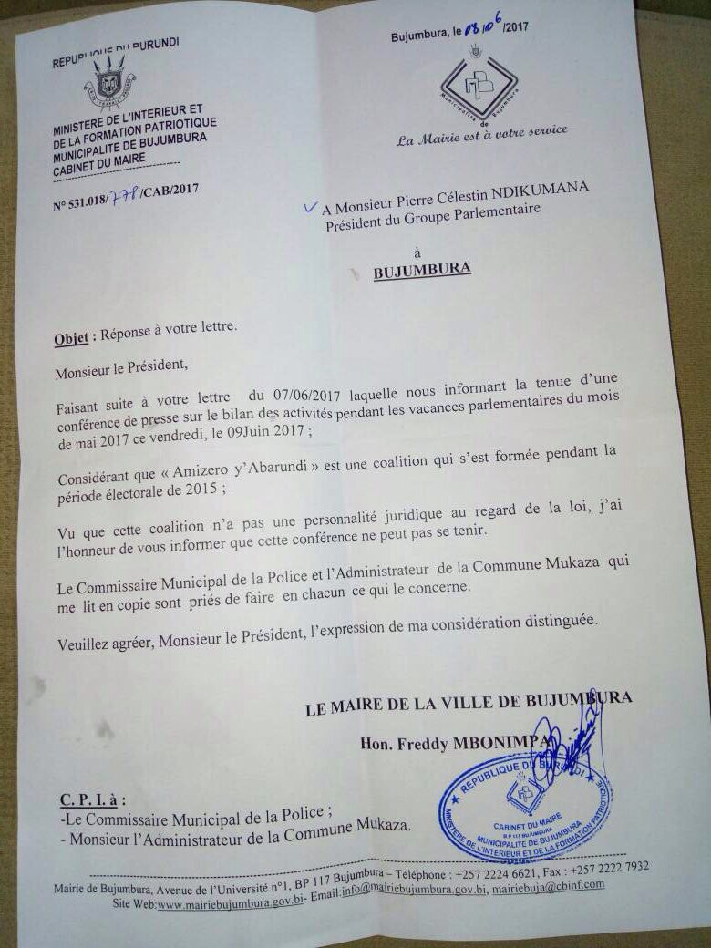 Nkuko tubibonye mw’ibaruwa ry’umukuru w’igisagara yandikiye umukuru w’urunani « Amizero y’Abarundi » , umukuru w’igisagara ca Bujumbura ategeka igipolisi n’imbonerakure gukora ibishoboka vyose ngo ikiganiro gitegekanijwe ejo kiburizwemwo. Aho tukibaza ukuntu cndd fdd itunganya, igatanga uburyo, ikararika n’imbonerakure mu biganiro umugaragu Banyikwa akoresha! Ico mwomenya, nuko ubwo butegetsi bwahiyo coba kuburyo kuva ejo ikete ryo kumenyesha ivyico kiganiro, ryanditswe, Ndayishimiye na Ntakarutimana batabajwe na Banyikwa bagumye bakora inama zurutavanako. Ariko rero, urugamba rwa politique rurabandanya. Ivyari kuvugirwa muri ico kiganiro c’akamarampaka muzobimenyeshwa vuba cane. Iyibize nabi uyima ifu. Démocratie iraroka Nkurunziza n akarwi bari kumwe. Tuzokwama turwanira agateka k’Abarundi gushika Uburundi bubaye ubw’Abarundi bose kandi bugasubizwa iteka.