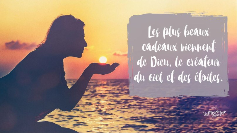 En général, c’est à l’occasion d’une célébration spéciale que l’on offre ou que l’on reçoit un cadeau. Savez-vous ce que je crois ? Je pense que Dieu n’attend pas d’occasion spéciale pour nous en faire ;-) Je crois que Dieu donne parce qu’Il aime. Et il aime en tout temps !La Bible dit « Tout ce qui nous arrive de bon, tous les plus beaux cadeaux viennent d’en haut. Ils viennent de Dieu, le créateur du soleil et des étoiles. Chez lui, il n’y a pas de changement, pas de mouvement, pas d’ombre. » (Jacques 1.17)