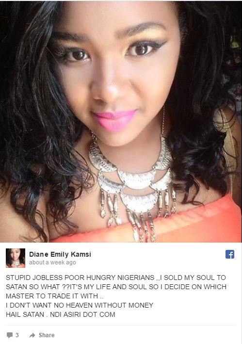 Elle a écrit: « PAUVRES NIGÉRIANS INSENSÉS, AFFAMÉS ET SANS EMPLOI. J’AI VENDU MON ÂME À SATAN ET QUOI? C’EST MA VIE ET MON ÂME, ALORS JE DÉCIDE AVEC QUI JE DOIS MARCHER… JE NE VEUX PAS D’UN PARADIS SANS ARGENT. GLOIRE À SATAN »
