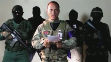 Yambaye impuzu za gisirikare akikujwe n’abantu bafise ibigwanisho kandi banyegeje amasura yabo, yahamagariye abanye Venezuela kwiyamiriza « intwaro y’umukazo »