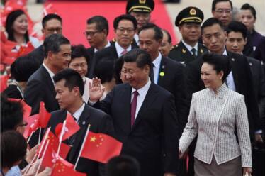 Prezida Xi yashitse mu rugendo rw’imisi itatu ari kumwe n’umupfasoni wiwe Peng Liyuan ku kibuga ca Chek Lap Kok. Bakiriwe n’indirimbo hamwe n’abana bazungagiza amabendera.