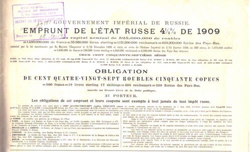 Alors qu’en février 1918, les titres russes ont été répudiés par le gouvernement soviétique, ils ont continué à faire l’objet de transactions jusque dans les années 1990.La politique du gouvernement français et d’autres gouvernements est directement liée à cette vie après la mort.