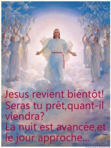 Il est ecrit dans l’apocalypse 3:11, Jesus affirme qu’il revient bientôt , Je viens bientôt. Retiens ce que tu as, afin que personne ne prenne ta couronne. Jésus a parlé 4 fois dans l’Apocalypse qu’il revient bientôt. Apocalypse 3:11, Apocalypse 22:7, Apocalypse 22:12, Apocalypse 22:20 Le Seigneur est à la porte et ci quelqu’un entend sa voix qu’il ouvre la porte , nous sommes à la derniere temps mes frères et soeurs, repentez-vous , car le temps est proche. Jesus-Christ est le Fils de Dieu, Il etait venue une première fois sur la terre sous la forme d’un homme semblable a nous. Il a séjourné dans ce monde, faisant du bien partout ou il passait. Il y a souffert, il est mort pour le salut de tous ceux qui croient en lui. Sa resurrection, suivie de son ascention au ciel ou il siège maintenant à la droite de Dieu. Jesus est le vrai chemin celui qui croit en lui vivra ,quand même il serait mort, c’est pourquoi Jesus a dit dans le livre Jean 14:13 et tout ce que vous demanderez en mon nom, je le ferai, afin que le Père soit glorifié dans le Fils . Jésus est le seul chemin du salut, par ce qu’il a affirmait dans le livre jean14:6 << Je suis le Chemin, la Vérité et la Vie. Nul ne vient au Père que par moi>> Lui même l’a promis aux apôtres dans le livre jean 14:1,3:<<Que votre coeur ne se trouble point. Croyez en Dieu et croyez en moi. Il y a plusieurs demeures dans la maison de mon Père. Si cela n’était pas, je vous l’aurai dit. Je vais vous préparer une place. Et lorsque je m’en serai allé, et que je vous aurai préparé une place, je reviendrai et Je vous prendrai avec moi afin que la ou je suis vous y soyez aussi. Cliquez sur le lien ci-dessous pour faire un don. Que le Tres Haut vous bénisse et q’uil bénisse tout ce que ta main va toucher!! Ne manquez pas cette bénediction.