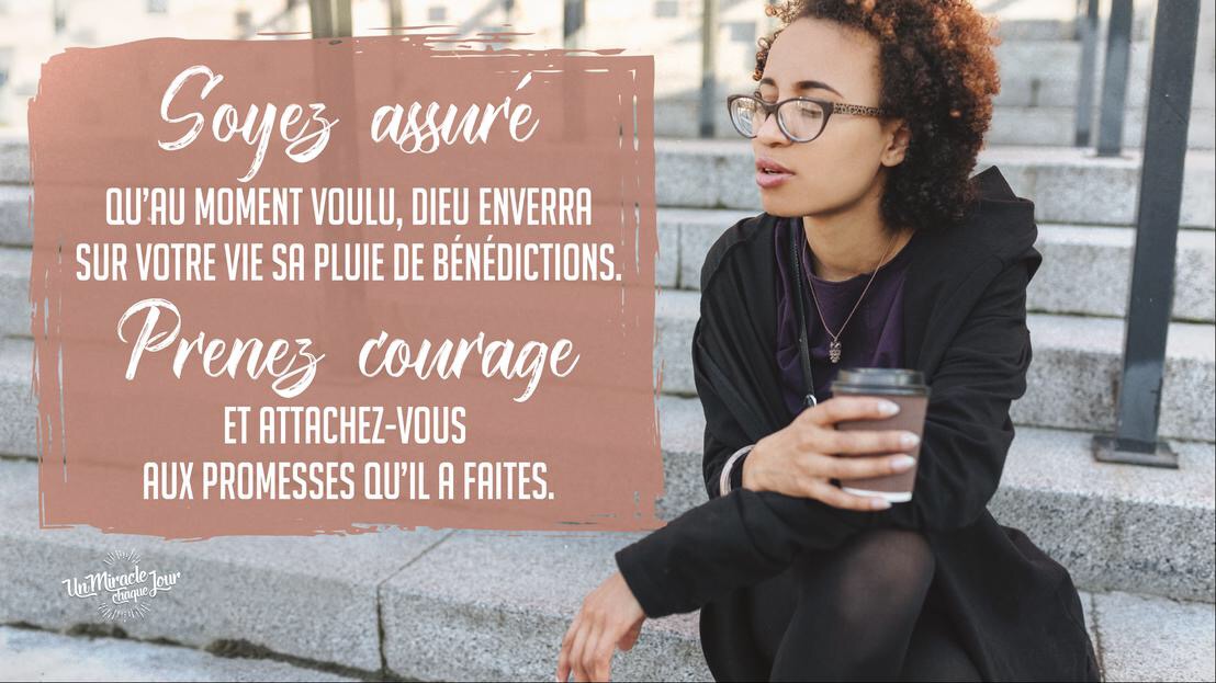 Soyez assuré(e) qu’au moment voulu, Dieu enverra sur votre vie SA PLUIE de bénédictions. Prenez courage et attachez-vous aux promesses qu’il vous a faites. Dieu ouvrira les écluses des cieux pour faire croître vos projets. Il tiendra parole.