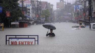 Umugabo w’umuhindi agwana n’amazi mw’ibarabara ry’imyuzure i Agartala, umugwa mukuru w’intara ya Tripura iri mu buraruko bushira ubuseruko.