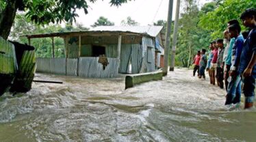 Abantu bahagaze baraba ivy’imyuzure yakoze hafi y’inzu ahitwa Kurigram, mu buraruko bwa Bangladesh. Imvura imaze iminsi myinshi igwa yatumye inzuzi
