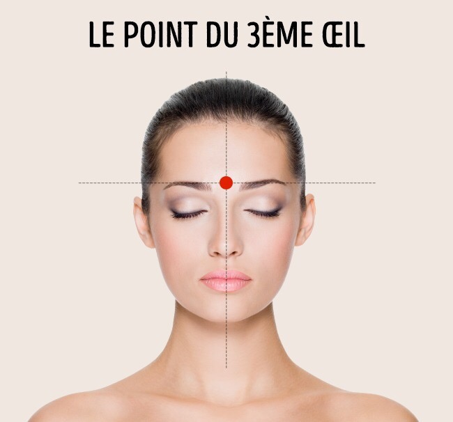 Le point du troisième œil se trouve entre les sourcils, là où l’arête du nez va vers le front. Ce point permet aussi de se débarrasser de la fatigue des yeux.