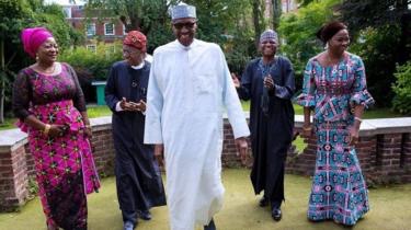 Prezida Muhammadu Buhari (hagati) yaragarutse mu gihugu ciwe avuye kwivuriza i Londres