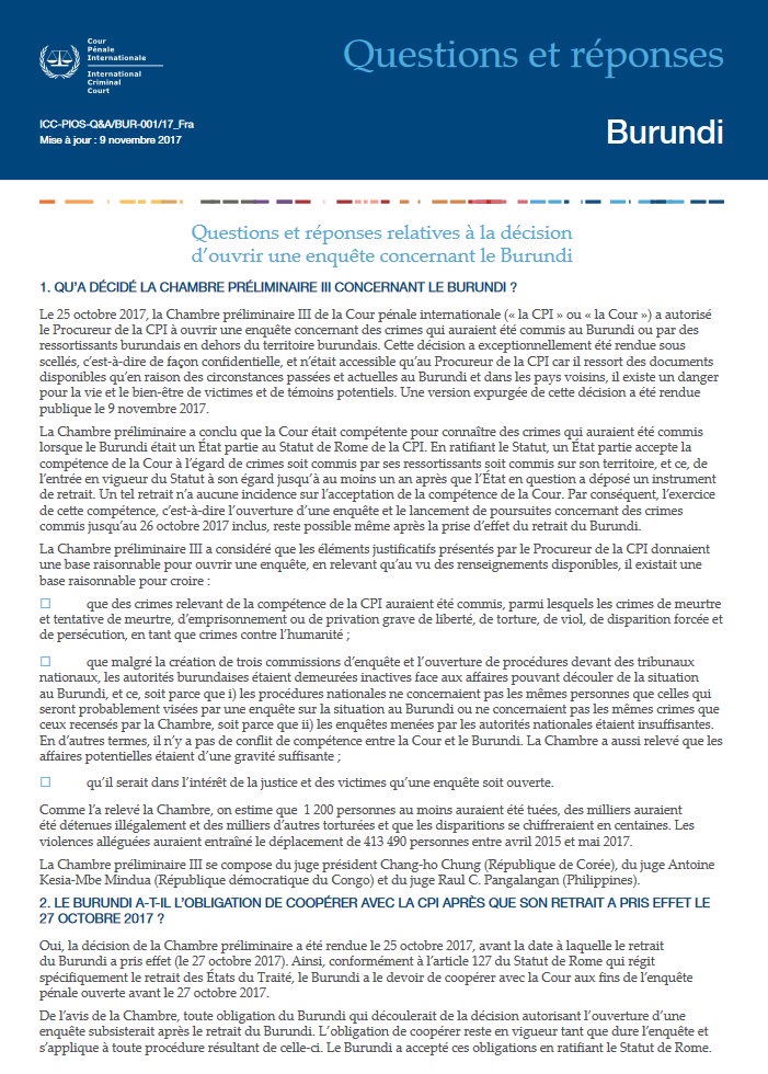 Aujourd’hui, 9 novembre 2017, la Chambre préliminaire III de la Cour pénale internationale (« la CPI » ou « la Cour »), composée des juges Chang-ho Chung (juge président), Antoine Kesia-Mbe Mindua et Raul C. Pangalangan, a rendu la version publique expurgée de la décision par laquelle elle a autorisé le Procureur de la CPI à ouvrir une enquête sur des crimes relevant de la compétence de la Cour qui auraient été commis au Burundi ou par des ressortissants burundais à l’extérieur de leur pays depuis le 26 avril 2015 et jusqu’au 26 octobre 2017. Le Procureur est autorisé à étendre son enquête à des crimes perpétrés avant le 26 avril 2015 ou se poursuivant après le 26 octobre 2017, si certaines conditions juridiques sont remplies.