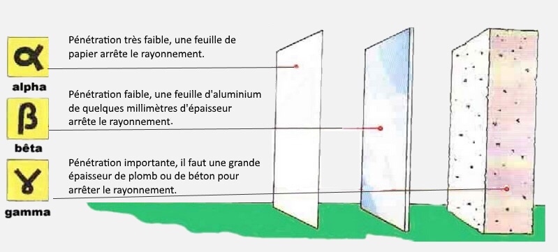• le rayonnement β (béta), arrêté par une feuille d’aluminium de quelques millimètres d’épaisseur.