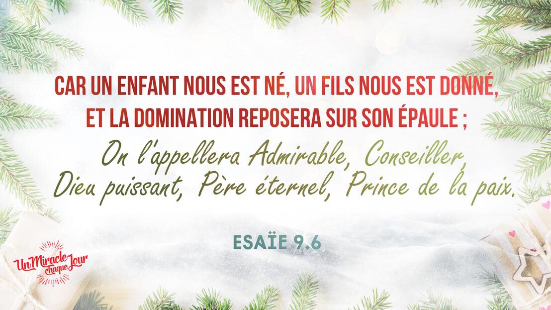 « Car un enfant nous est né, un fils nous est donné, Et la domination reposera sur son épaule ; On l’appellera Admirable, Conseiller, Dieu puissant, Père éternel, Prince de la paix. » (Esaïe 9.6)