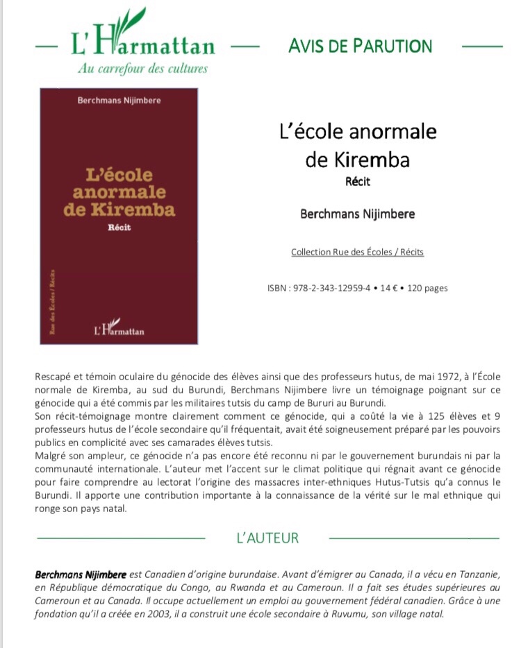 Burundi-Canada: parution du livre « Ecole anormale de Kiremba » de Berchmans Nijimbere