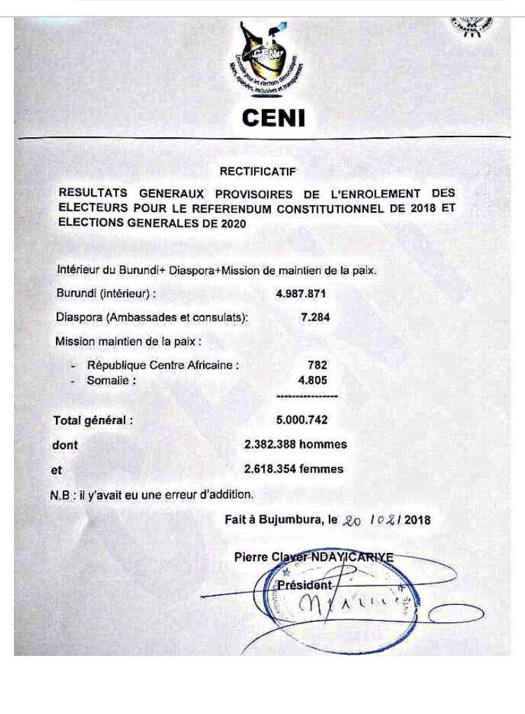 Mw’itangazo ryo gukosora ryateweko umukono na Pierre Claver NDAYICARIYE arongoye umurwi CENI kur’uyu wa kabiri igenekerezo rya 20 Ruhuhuma 2018, amenyesha ko abitavye mu gihugu hagati bashika kuri 4.987.871, mu gihe abitavye bose hamwe harimwo n’abari hanze y’igihugu ari 5.000.742.