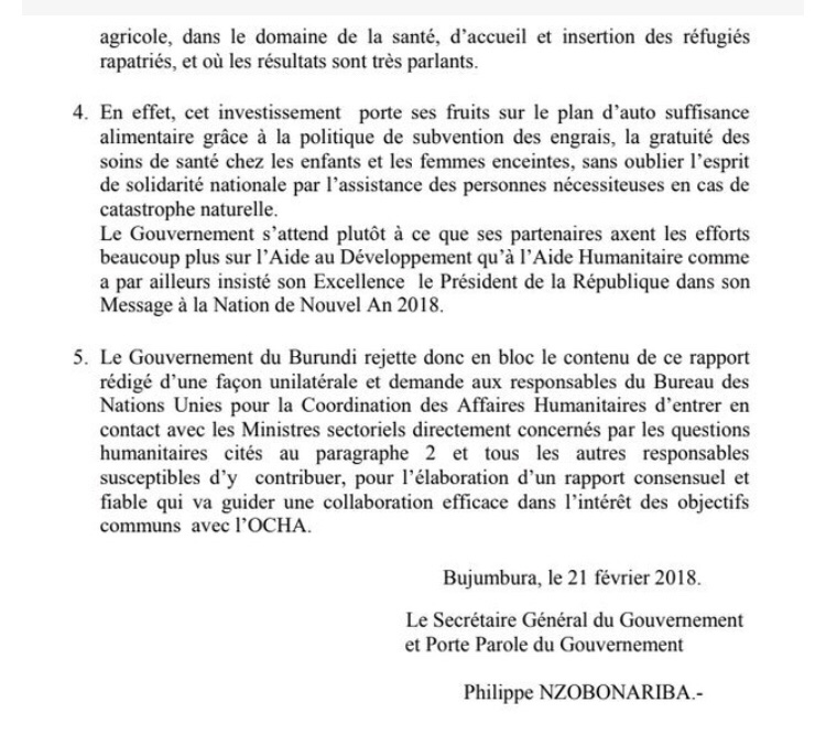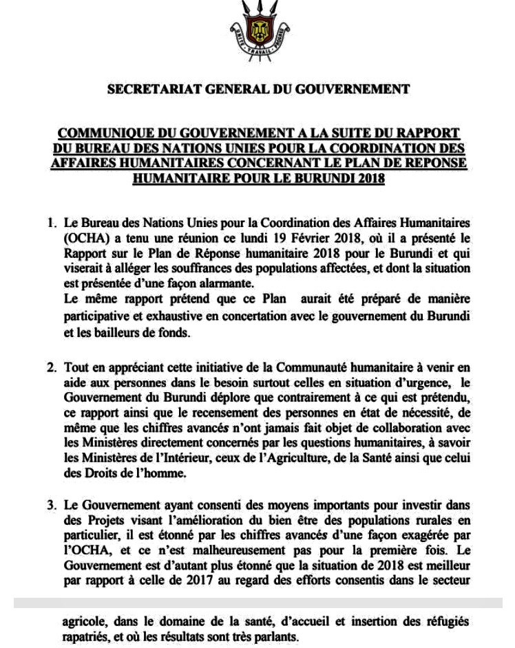 Le gouvernement burundais rejette en bloc le rapport de l’OCHA (communiqué)