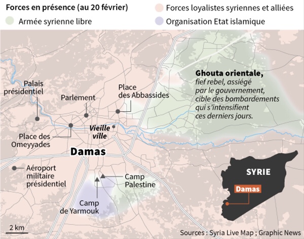 Le 5 février 2018, le régime lance une offensive aérienne d’une intensité inédite sur la Ghouta orientale, faisant environ 250 morts parmi les civils et des centaines de blessés, en cinq jours. Ces derniers jours, l’armée a envoyé des renforts aux limites de la Ghouta orientale. « L’offensive [terrestre] attend juste le feu vert », selon l’OSDH.