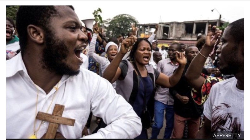 (Muri rino joro, amajana y’abayoboke b’umugambwe uri ku butegetsi bari kuri katedarare ya Kinshasa mu ntumbero yo guhagarika imyiyerekano yari itegekanijwe).