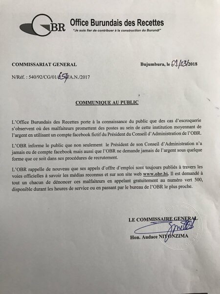 OBR isaba uwobona uwuriko asaba amafaranga abanyagihugu abemerera akazi muri ico kigo, ko yohamagara ku murongo utariha ariwo 500, canke akitura ahakorera OBR hamwegereye.