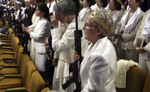 Ce mercredi 28 février, l’Eglise organisait une cérémonie de mariage collectif comme Moon père les affectionnait. Mais, nouveauté, son fils avait encouragé les participants – environ 500 personnes – à montrer leur volonté de défendre leur famille et leur religion en apportant une arme semi-automatique de type AR-15 – chargeur vidé et verrouillé pour éviter tout incident.