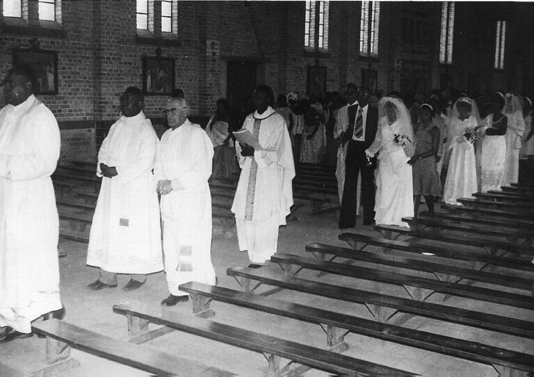 La procession au début du mariage de Léon Mugesera et Gemma Uwamariya, le 7 octobre 1978. Trois des quatre prêtres ayant célébré le mariage sont tutsis : l’abbé Félicien Muvara, l’abbé Alexis Kagame et l’abbé Mathias Runyange. Le quatrième prêtre est un Belge, le chanoine Eugène Ernotte.