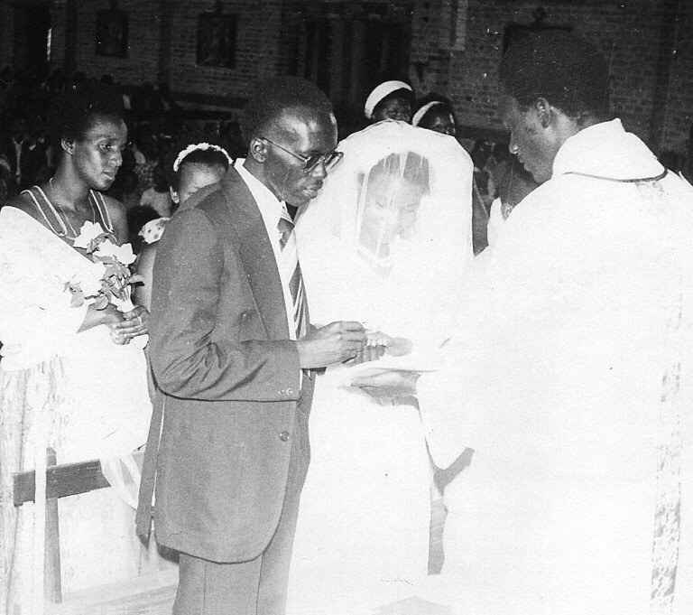 Échange d’alliances devant le célébrant principal, l’abbé Félicien Muvara, un Tutsi qui était un bon ami de Léon.