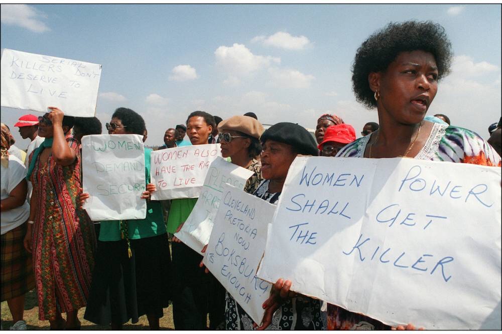 Les femmes du Congrès national africain (ANC) manifestent durant la visite du président Nelson Mandela après une série de meurtres en série à Boksburg, à l’est de Johannesburg, le 21 septembre 1995. © AFP/Gary Bernard
