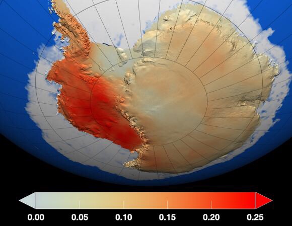 L’épaisseur des glaces est plus mince en Antartique de l’ouest qui est de plus en plus soumise à des augmentations de température.
