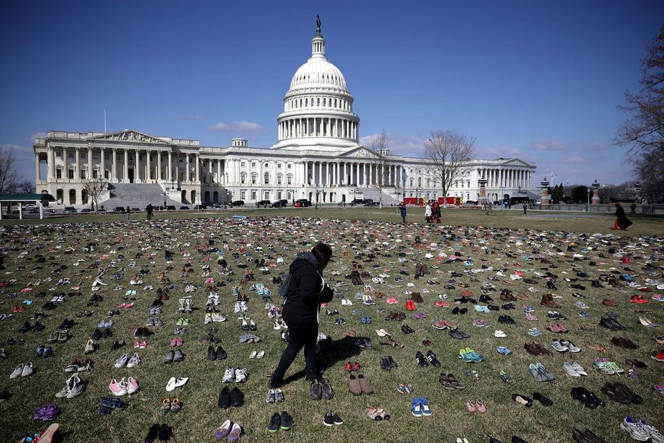 7000 chaussures ont été déposées devant le Capitole à Washington, mardi, pour représenter les milliers de décès par balles survenus aux États-Unis depuis la tuerie de Sandy Hook en décembre 2012.
