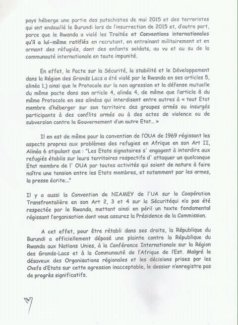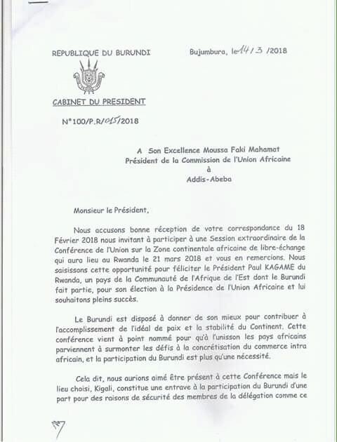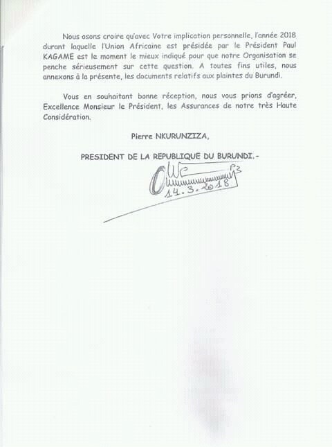 Dans ce courrier, le Président du Burundi souhaite “plein succès” au Président du Rwanda Paul Kagame comme nouveau Président de l’Union Africaine, en rappelant au Président Faki que le Rwanda héberge beaucoup de putschistes du 13 Mai 2017, un coup d’Etat qui a failli plongé le Burundi dans le chaos. Voici la lettre : https://www.burundi-forum.link/wp/wp-content/uploads/2018/03/bdi_burundi_ua_kigali_2018.pdf