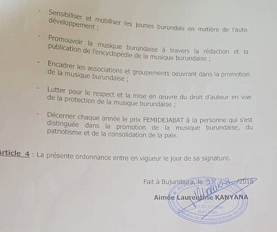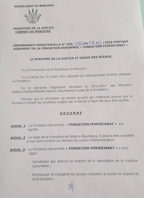 Agrément de la Fondation FEMIDEJABAT par le Ministère de la Justice du Burundi