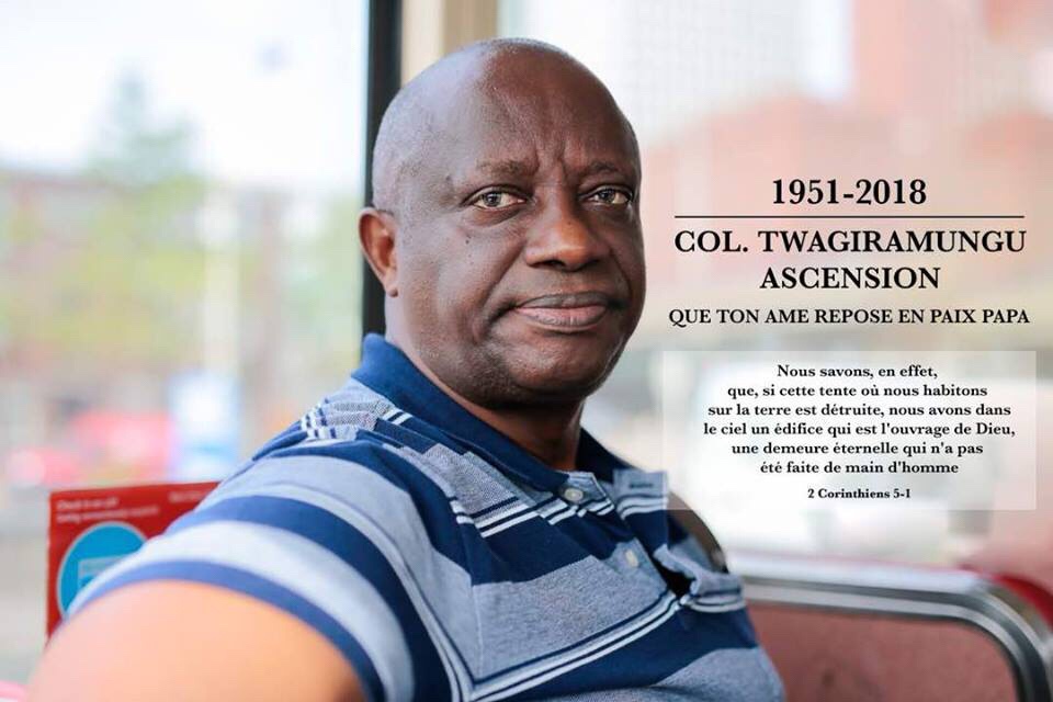 Le 29 Mars, nous apprenions avec douleur le décès d’un père, un frère, un ami, un homme dévoué au service de son pays et de sa famille, le colonel Ascension TWAGIRAMUNGU. Il a été un exemple et un modèle pour beaucoup. Alors que nous nous préparons à lui rendre les derniers honneurs, nous partageons le programme intégral à tous ceux qui, de près ou de loin l’aimaient, l’admiraient et le respectaient et ainsi voudraient se joindre à nous dans cet acte final.