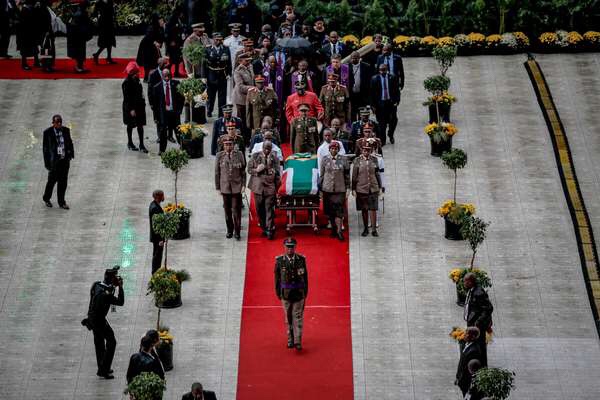 Dans les gradins, il y a le peuple qui l’aimait tant. Ceux qui n’ont pas eu peur de braver les difficultés logistiques pour venir s’asseoir dans les gradins dès quatre heures et demie du matin, pour être certain d’y être quand tout commencera, cet hommage en grand dans une famille politique déchirée par ses factions. Aujourd’hui, on devrait, en théorie, essayer d’oublier les divisions, mais les enterrements de l’ANC, décidément, ne sont pas faits pour se transformer en moments de tiédeur, mais d’accusations.