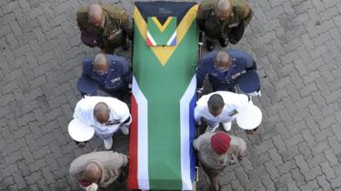 Isandugu ry’ibisigarira vyiwe ripfuswe n’idarapo y’igihugu, umwuzukuru wiwe Swati Dlamini Mandela niwe yashikirije ijambo ry’umuryango.