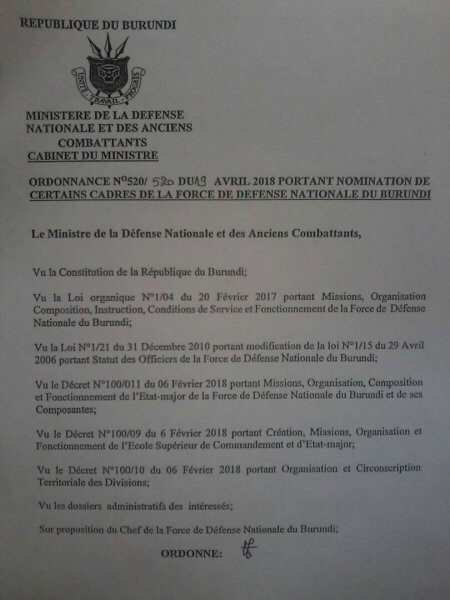 Itegeko inomero 520/520 ryo kw’igenekerezo rya 19 Ndamukiza 2018 ryateweko umukono n’umushikiranganji wo kwivuna abansi rimenyeshako Colonel Gregoire NGENZAHAYO azoba ajejwe ivy’intwaro,Colonel Edouard RIVUZUMWAMI azoba ajejwe gutunganya ibikorwa(Logistique),Colonel Gaspard GASANZWE agiye kuba uwujejwe ibijanye n’amategeko hamwe na Colonel Philippe NKEZABAHIZI agiye kuba uwujejwe ivy’inyigisho.