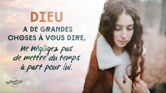 À partir d’aujourd’hui, pourquoi ne pas prendre à part une dizaine de minutes par jour et les utiliser pour ne rien faire sauf écouter Dieu ? Posez-vous, loin des distractions. Sur votre lit, sous votre douche, peu importe. Laissez les idées venir à vous. Dieu saura utiliser ce temps où vous n’êtes pas pris(e) par mille distractions pour vous parler… et il a de grandes choses à vous dire, Dr.