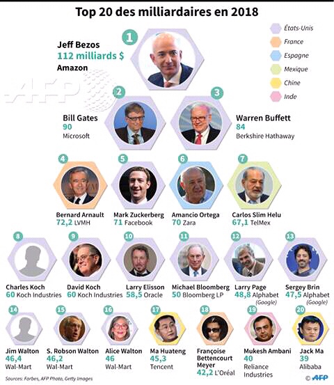 Umunyamerika Jeff Bezos, niwe aza mu kibanza ca mbere kw’isi, mu bantu batunze kurusha abandi. Uwo akurikirwa n’abandi babiri nyene bava mu gihugu ca Reta Zunze Ubumwe za Amerika, harumwo uwamaze igihe kinini ari muri ico kibanza.