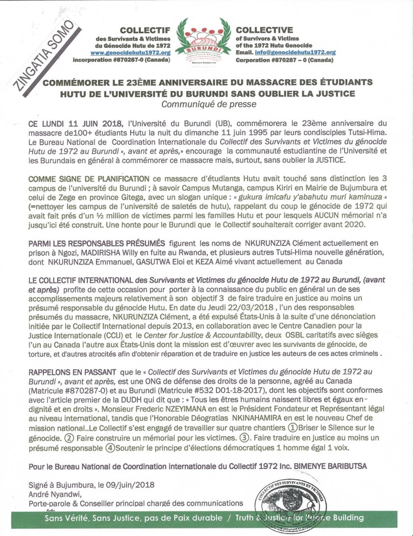Heureusement que ces rescapés ne n’ont pas l’esprit de vendetta sinon, il y aura un bon nombre de ceux qui, actuellement ont préféré se cacher derrière la société civile juste pour se passer de défenseurs des droits de l’Homme, alors que ce sont eux qui doivent répondre devant la justice sur les massacres qu’ils ont commis cette nuit du 11 juin 1995, qui seraient déjà en prison et montreraient les fausses communes où gissent les restes de nos frères et soeurs.