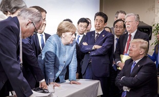 • On y voit la chancelière allemande en position de force, entourés de ses homologues britanniques, français et japonais, face à un Donald Trump assis.