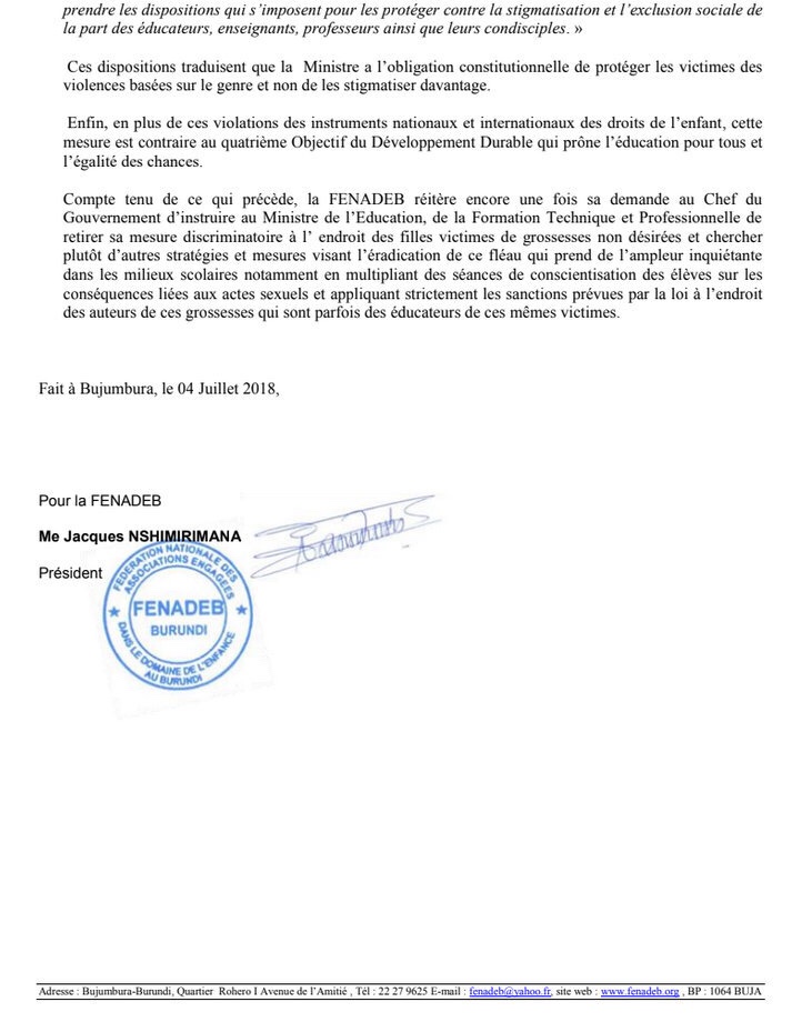 Abisezerano Réaction de la FENADEB sur la circulaire du Ministre de l’Éducation en rapport avec les victimes des VBG Lien6 juillet 2018 Ihanga ry-Imana Réaction de la FENADEB sur la circulaire du Ministre de l’Éducation en rapport avec les victimes des VBG Communiqué de presse Partager : Partager sur X(ouvre dans une nouvelle fenêtre) X Partager sur Facebook(ouvre dans une nouvelle fenêtre) Facebook Partager sur LinkedIn(ouvre dans une nouvelle fenêtre) LinkedIn Partager sur Telegram(ouvre dans une nouvelle fenêtre) Telegram Partager sur WhatsApp(ouvre dans une nouvelle fenêtre) WhatsApp Envoyer un lien par e-mail à un ami(ouvre dans une nouvelle fenêtre) E-mail Imprimer(ouvre dans une nouvelle fenêtre) Imprimer J’aime chargement… Similaire
