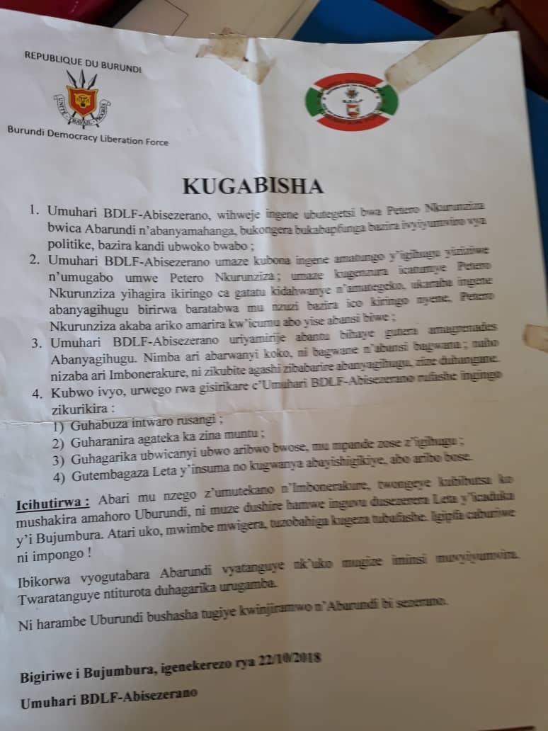 Selon des sources concordantes, ce groupe d’individus dont le nombre oscillait à une centaine, serait passé aux environs de 4h du matin. D’après ces mêmes sources, ces individus étaient armés. Et mis de côté, les tracts qu’ils ont laissés sur cette colline de Muhanda, on ne signale aucun autre incident. Ces mêmes sources soutiennent que les tracts jetés, ce groupe d’inconnus aurait pris le tronçon Kavimvira avant de bifurquer vers la réserve naturelle de Kigwena. Zone par le passé, ayant servi de bastion aux rebelles du Cndd-Fdd du temps du maquis.