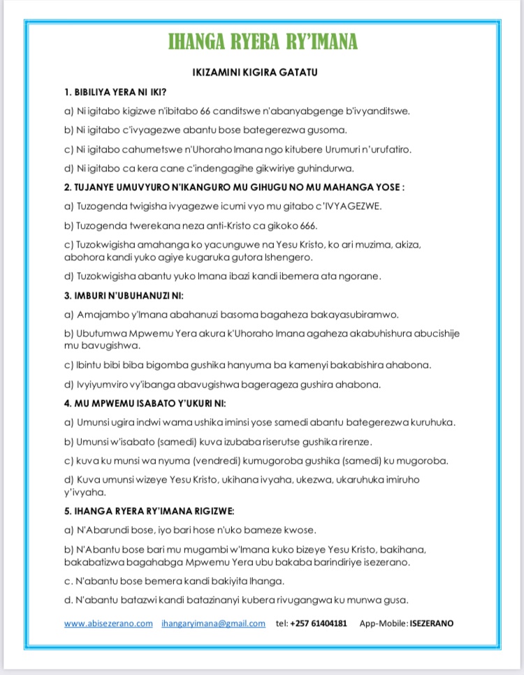 c) Ni igitabo cahumetswe n’Uhoraho Imana ngo kitubere Urumuri n’urufatiro. d) Ni igitabo ca kera cane c’indengagihe gikwiriye guhindurwa. - TUJANYE UMUVYURO N’IKANGURO MU GIHUGU NO MU MAHANGA YOSE :