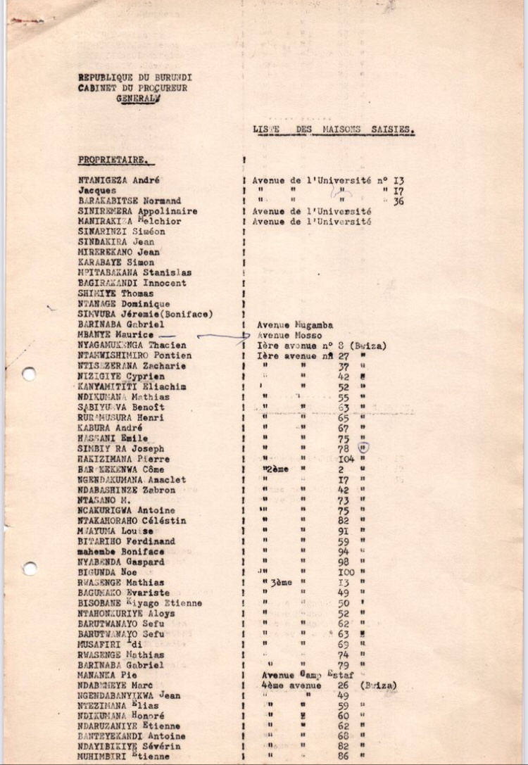 Irabire amazu bagiriye rusansuma mu 1971 hanyu mu 1972 beneyo bakicwa uretse abaciye mu rw’imbga kazi bagahunga, bose ivyabo bikanyagwa urukombamazi. Impfuvyi n’abapfakazi bagasigara bipfumbereje. Aka gatabo k’impapuro 67 kanditsemwo amazina y’abantu banyazwe amazu, imiduga n’ibindi hakurikijwe intara, ama komine, amazone n’imitumba mu bidahara no mu gihugu hagati.