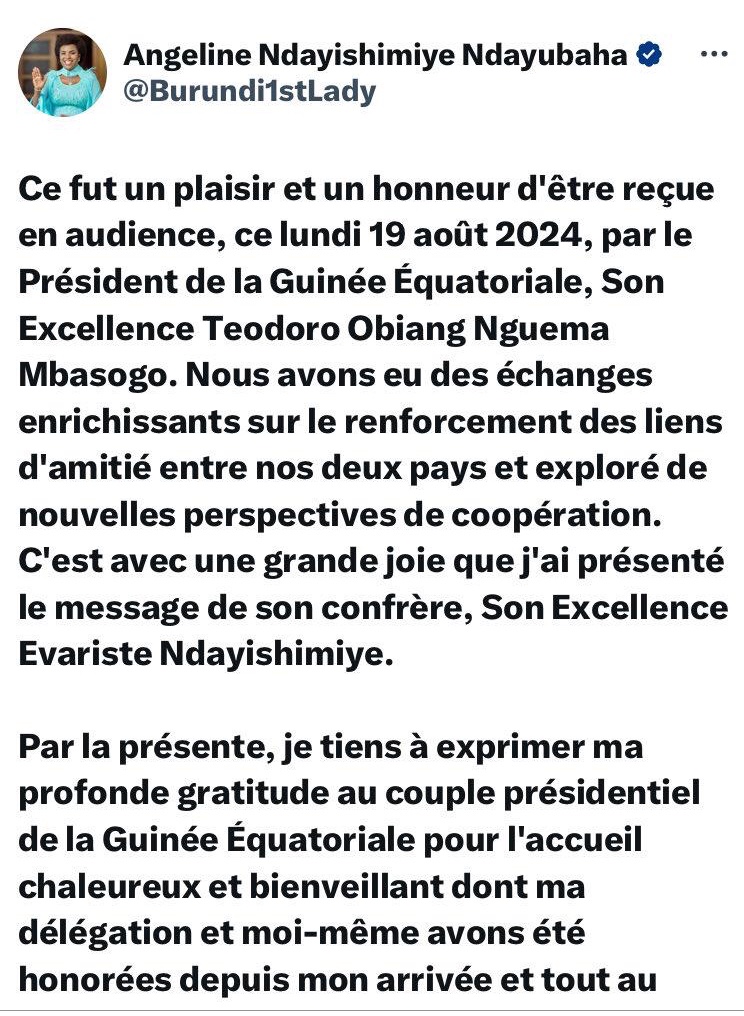 Kurubuga rwiwe rwa X yanditse ubgo butumwa yongera arabukurako. Ni ubutumwa bgerekana yuko yagiye kubonana n’umukuru w’igihugu ca Guinee atwaye ubutumwa bg’igihugu c’uburundi bakongera bakavugana ivyerekeye imigambi n’imigenderanire y’ibihugu vyompi. Ayo ni amabanga ashingwa intumwa za leta y’Uburundi n’abashikiranganji, amabanga arangurwa n’abagenwa n’amabgirizwa y’igihugu hisunzwe ibgirizwa shingiro.