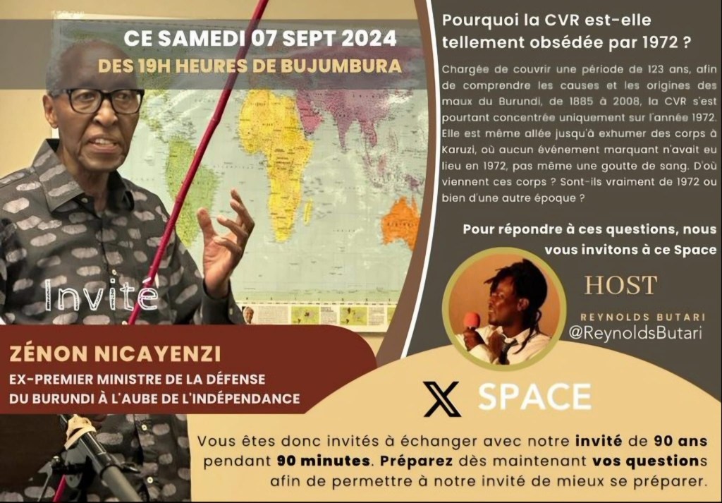 Umukuru w’umugwi CVR yagize ati: “1960-1969. 1971.1972-1973: Iyi myaka mibi yahekuye imiryango mu Burundi, Zénon Nicayenzi ayizi yose. Ivyabaye igihe mu 1965 hagandagurwa Umushikirangoma Petero Ngendandumwe, #CVR yarabishize ahabona. Guhenda Abarundi ntibigishoboka! Ukuri kurateye ubwoba!”